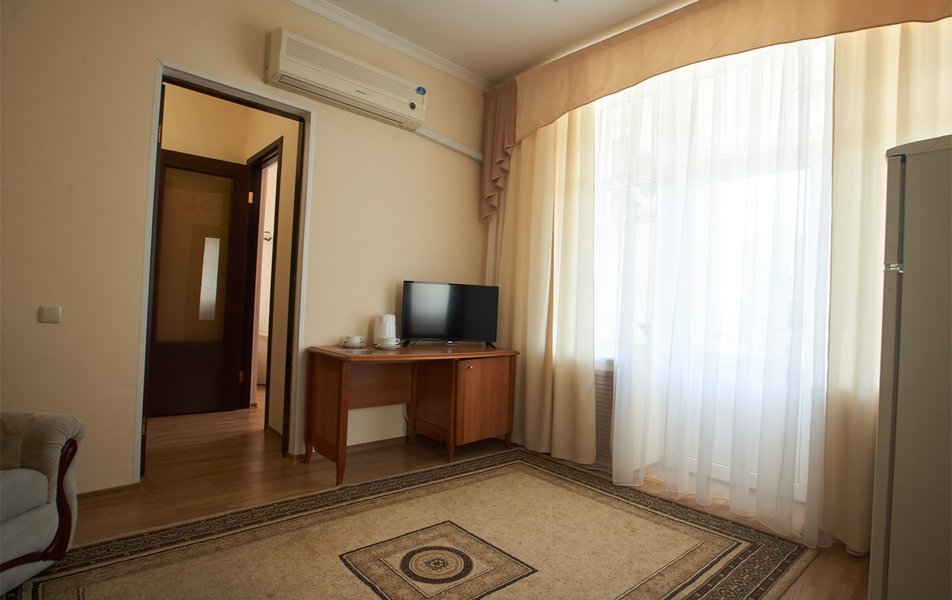 В номере: вешалка, зеркало, кресло, диван, кровати односпальные, двуспальная кровать, прикроватные тумбочки, стол, столик журнальный, шкаф, телевизор, телефон, холодильник, чайный набор посуды, электрочайник