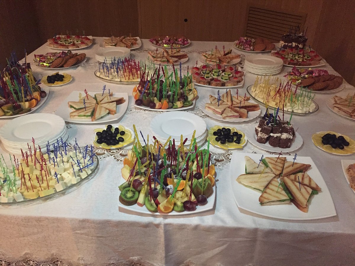 В столовой гостям предлагаются завтрак, обед и ужин, состоящие из нескольких блюд: свежие салаты, горячие закуски, основные блюда, а также десерты. Завтраки могут включать как классические блюда, такие как овсянка, яйца, так и разнообразные выпечку и свежие фрукты. На обед и ужин предусмотрены меню, в которое входят мясные и рыбные блюда, гарниры из овощей, круп и картофеля, а также вегетарианские опции.